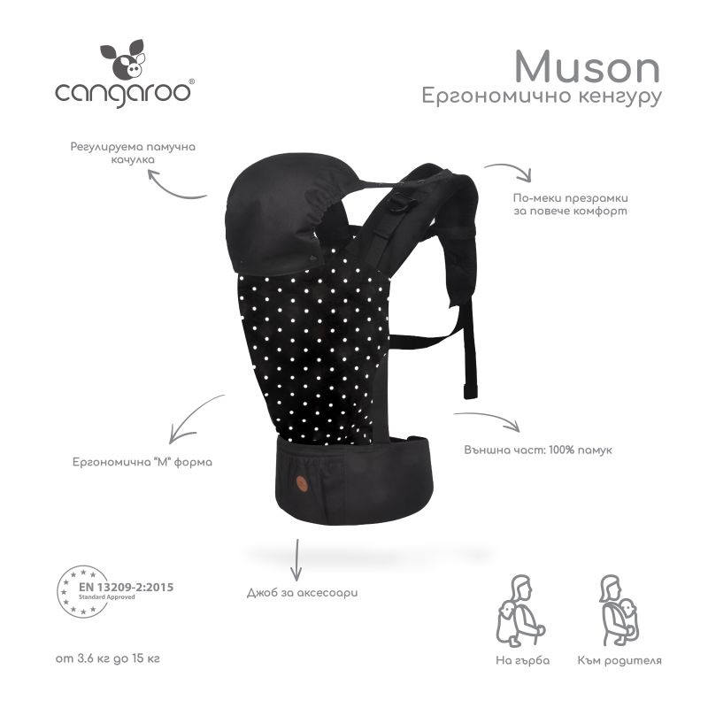 Кенгуро Muson е изключително удобен продукт, подходящ за бебета на възраст от 5 месеца до 15 кг. Основните му части, както и подвижната качулка, са изработени от 100% памук, което го прави подходящо за употреба през всички сезони. Качулката осигурява защита за главата на бебето и спомага за по-добър сън.