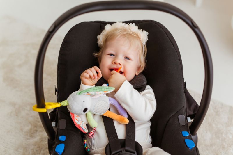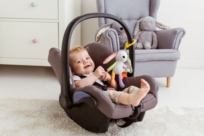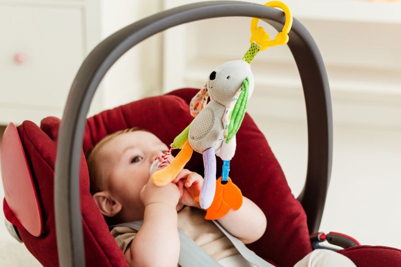 Компактното зайче ще бъде идеалният спътник за първите ви разходки. Играчката е изработена от материали с разнообразни шарки и текстури, благодарение на които стимулира сетивата на малкото дете, като го насърчава да опознава света чрез сетивни средства. Към лапите на зайчето са прикрепени две допълнителни играчки: мека гризалка и тракаща халка с мъниста. Малкият размер на висулката ще ви позволи да я носите винаги със себе си, за да може да развеселява вашето мъниче навсякъде. Практичната дръжка, с която е оборудвана играчката, позволява лесното й закрепване навсякъде.