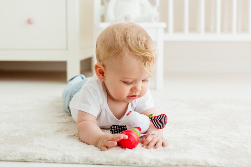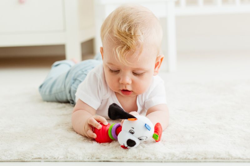 Веселата дрънкалка съдържа много изненади, които вашето бебе ще хареса! Играчката е украсена с подвижни рингове и главата на кучето, което се люлее очарователно от едната страна на другата при разклащане. Топката за захващане на дрънкалка има текстурирана повърхност, което я прави по-лесна за задържане в дръжката. Играчката е изработена от материали с разнообразна текстура, която стимулира сетивата на бебето, насърчавайки го сетивно да открива света.