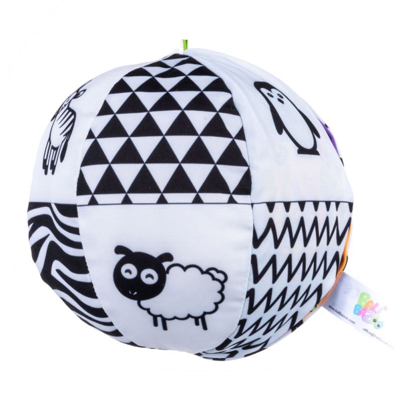 Меката двустранна топка е любима играчка на всички деца. Контрастните цветове стимулират зрението, а черно-белите части на топката са подходящи за развитието на зрението на новородените.