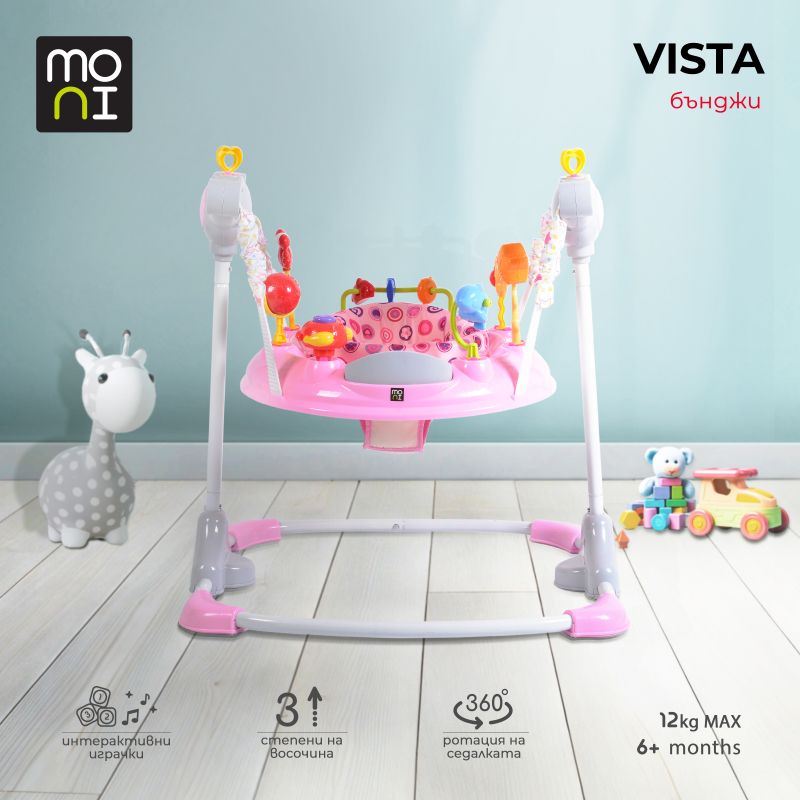 Vista е проектирана така, че детето ви може безопасно да подскача, използвайки крачетата си, докато се забавлява върху текстилна подложка. Лекото движение нагоре и надолу не само носи радост, но също така помага за укрепване на мускулите на краката и развиване на координацията.