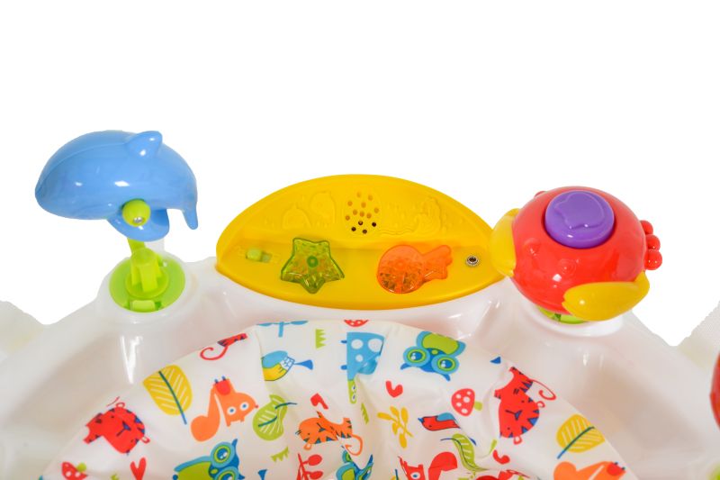 Вградените интерактивни играчки в различни ярки цветове и форми, както и музикалното табло със светлини и две нива на звука, развиват фината моторика и сетивното възприятие. Възможността за свързване на MP3 устройство добавя допълнително музикално забавление.