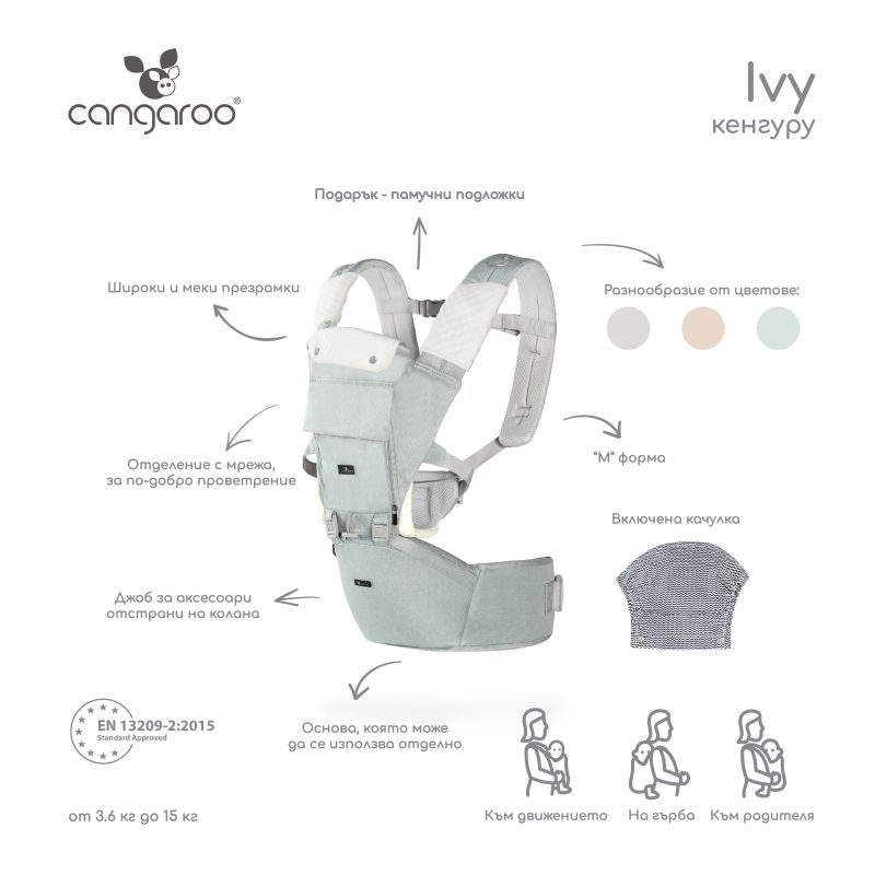 Кенгуру Ivy е перфектното решение за удобно и безопасно носене на бебето, осигурявайки както комфорт на детето, така и на родителя. Подходящо за деца от 5 месеца до 15 кг, кенгуруто е изработено от полиестер с вътрешна част от мрежеста текстура, която осигурява по-добра вентилация и комфорт за бебето.