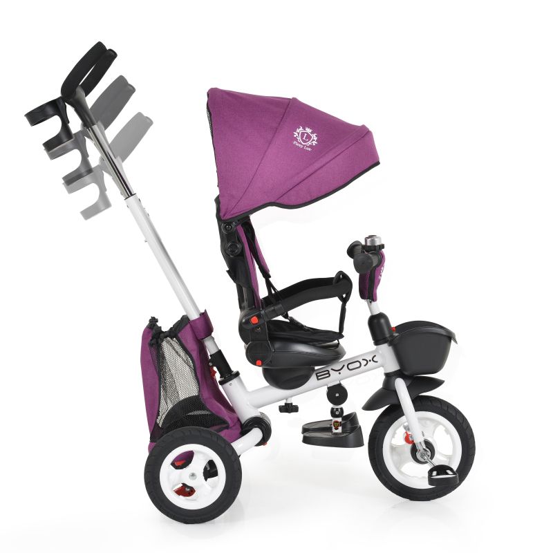 Функции:Предпазен колан 3-точков•Телескопична дръжка•Седалка въртяща се на 360°•Сваляща се тапицерия•Сваляща се дръжка•Регулируема облегалка•Поставка за чаша•Поставка за крака•Мека тапицерия•Кош преден за аксесоари•Звънец•Заключване на педалите•Дръжка с възможнос