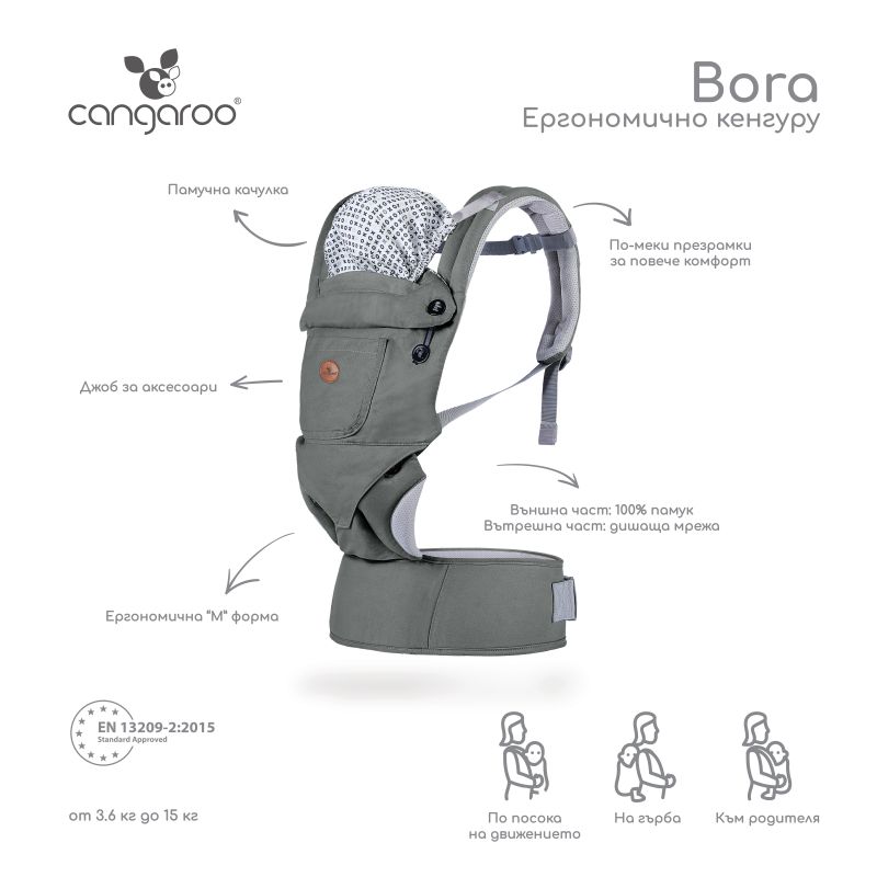 Това кенгуру е създадено с мисъл за удобството на детето и родителя, като е подходящо за деца на възраст от 5 месеца до достигане на тегло до 15 кг. Горната част на кенгуруто и качулката са изработени от 100% памук, осигурявайки комфорт и мекота при контакт с кожата на бебето. Вътрешната част на кенгуруто е с мрежеста структура от 100% полиестер, която подпомага циркулацията на въздуха и прави продукта дишащ и удобен за носене през всички сезони.