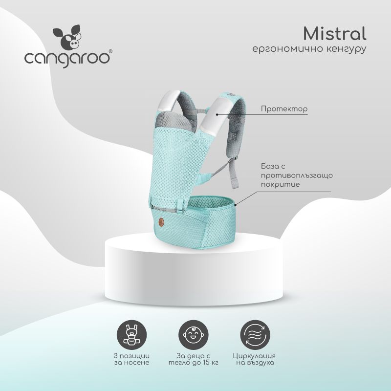 Ергономичното кенгуру с база Mistral е проектирано с мисъл за максималния комфорт на детето и родителя, като специалният дизайн с мрежест текстил осигурява отлична вентилация и циркулация на въздуха. Това го прави особено подходящо за използване през топлите месеци. Кенгуруто е предназначено за деца на възраст от 5 месеца и може да се използва до достигането на тегло от 15 кг. Трите основни позиции за носене включват лице към родителя, по посока на движението и на гърба на родителя, което предоставя гъвкавост и удобство за различни ситуации.