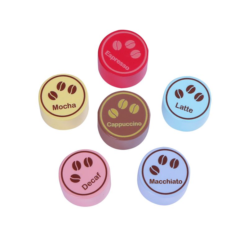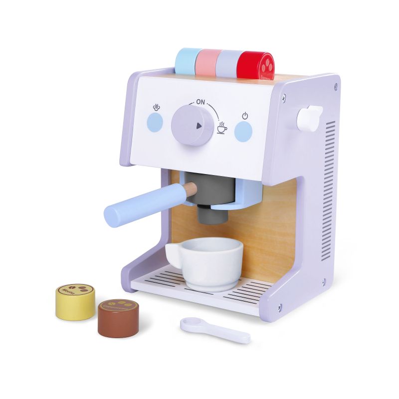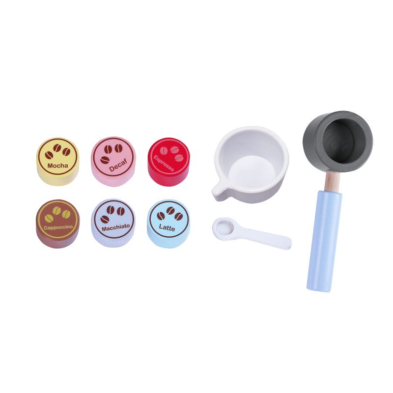 Към уникалната кафемашина са включени няколко цветни капсули, чашка и лъжичка. Въртящите се дървени елементи спомагат за развиване на въображението и социалните умения на децата и правят дните им още по-весели.