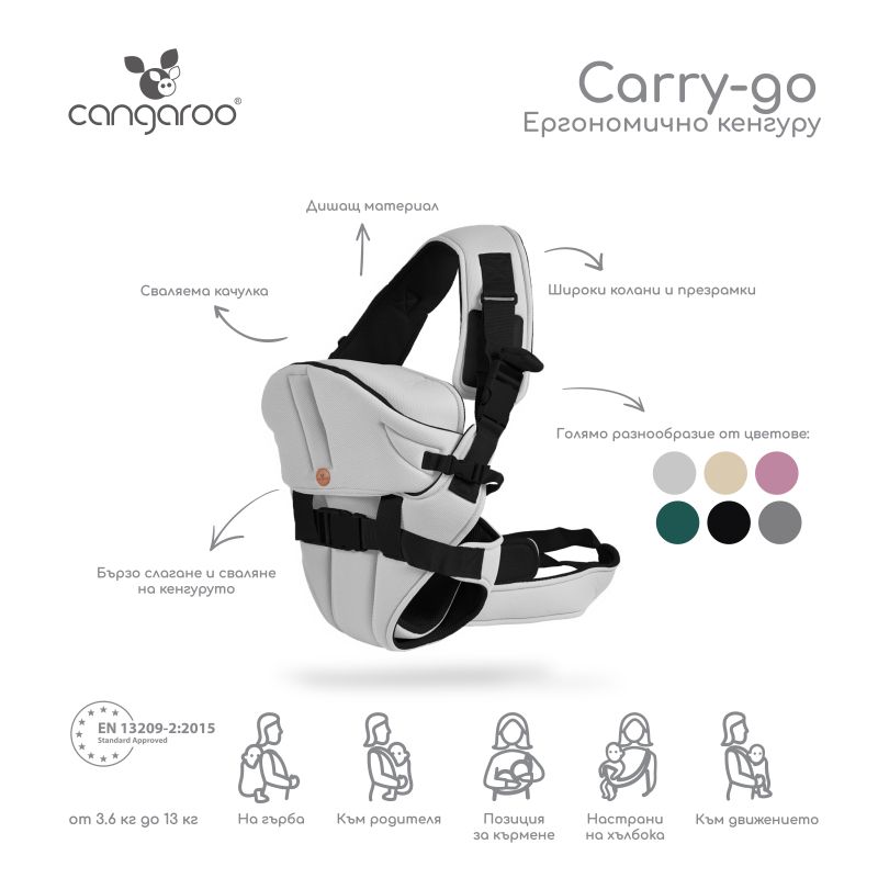 Carry Go е перфектният избор за родители, търсещи удобство и гъвкавост при носенето на своето дете. Подходящо за малчугани с тегло от 3.60 до 13.00 кг, то предлага разнообразни начини на носене: