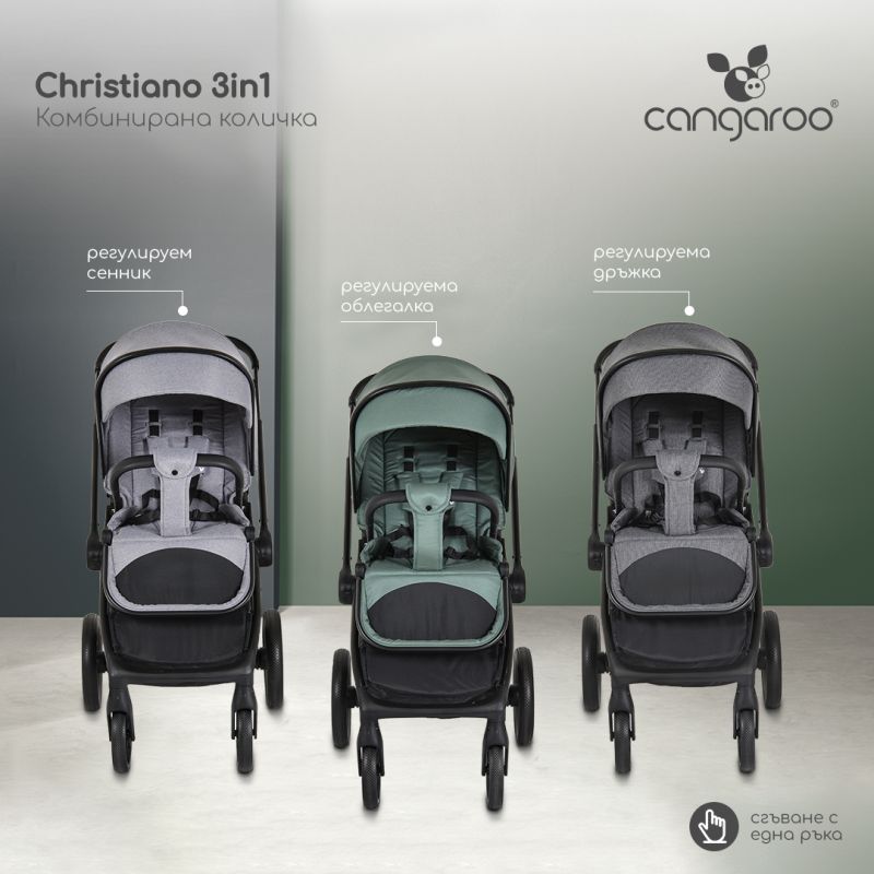 Бебешката количка Christiano 3 в 1 – Cangaroo е създадена за родители, обичащи красивoто и е подходяща за новородени бебчета и деца с тегло до 22 kg. Олекотеното шаси и богатата окомплектовка допълват уникалния дизайн.