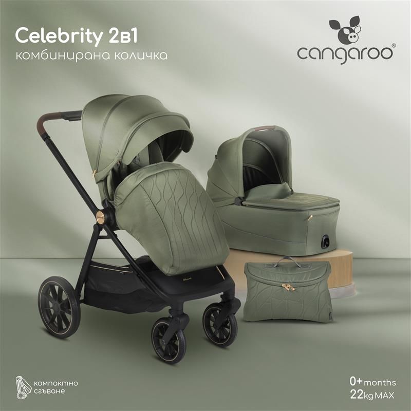 Комбинирана количка 2 в 1 Celebrity, Cangaroo, създадена с мисъл за динамичното ежедневие на родителите и пълния комфорт на детето. Подходяща за деца от раждането до 4 години (или до 22 кг). Сгъва се лесно, управлява се леко и предлага множество удобства – както за града, така и за разходки извън него.