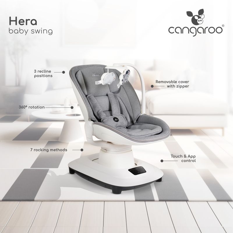 Подарете на вашето бебе комфорт, безопасност и нежно люлеене с люлката Hera от Cangaroo – модерно решение, което съчетава стил, функционалност и иновативни технологии. Управлявайте всички функции лесно чрез тъч скрийн панела или мобилното приложение и се насладете на спокойни моменти, докато вашето дете се забавлява или отпочива. С изключително тих механизъм, почти безшумен при работа, Hera гарантира спокойствие за бебето и тишина за родителите.