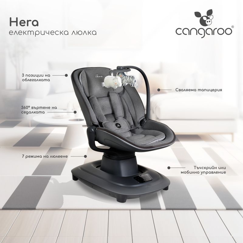 Подарете на вашето бебе комфорт, безопасност и нежно люлеене с люлката Hera от Cangaroo – модерно решение, което съчетава стил, функционалност и иновативни технологии. Управлявайте всички функции лесно чрез тъч скрийн панела или мобилното приложение и се насладете на спокойни моменти, докато вашето дете се забавлява или отпочива. С изключително тих механизъм, почти безшумен при работа, Hera гарантира спокойствие за бебето и тишина за родителите.