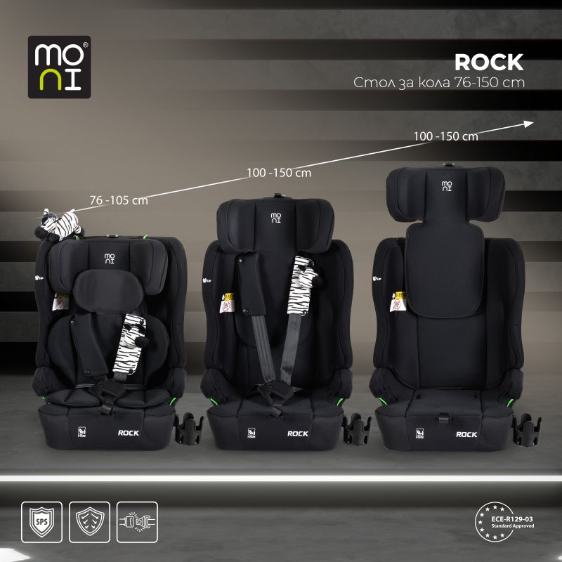 Rock от Moni е практично и надеждно столче за кола, създадено да осигури сигурност и удобство за вашето дете. Моделът е одобрен по най-новия европейски стандарт R129/i-Size и е подходящ за монтаж по посока на движението за деца с височина от 76 до 150 см.
