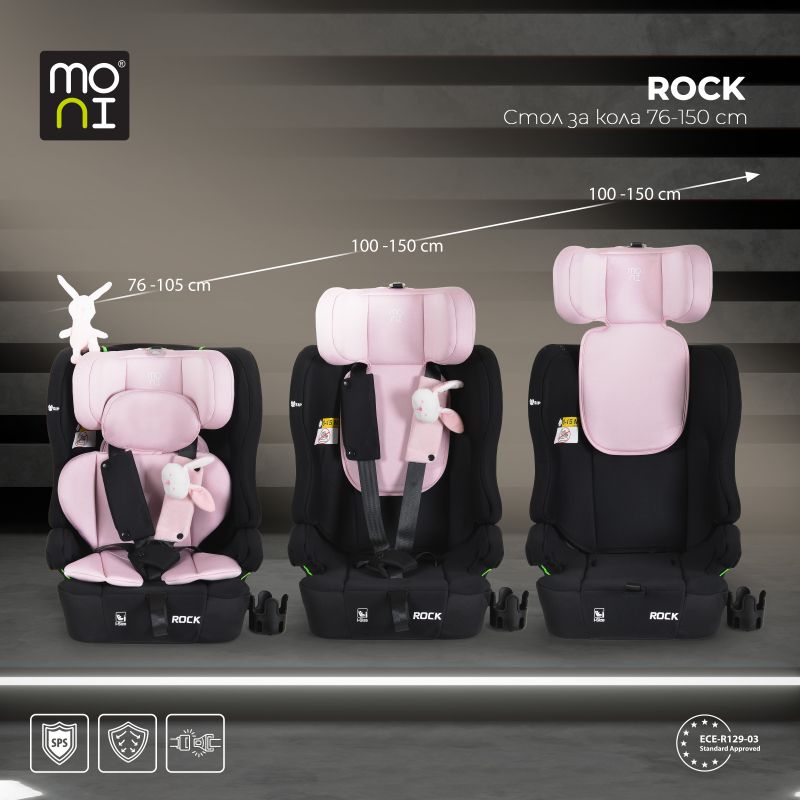 Rock от Moni е практично и надеждно столче за кола, създадено да осигури сигурност и удобство за вашето дете. Моделът е одобрен по най-новия европейски стандарт R129/i-Size и е подходящ за монтаж по посока на движението за деца с височина от 76 до 150 см.