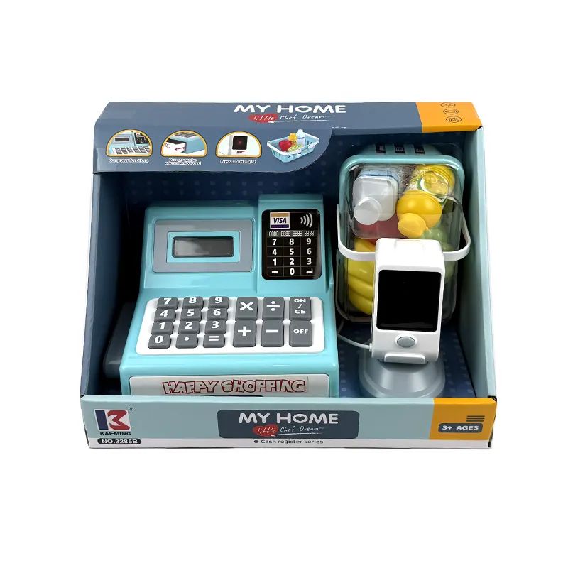 Детският касов апарат Happy Shopping е идеален за ролеви игри „магазин“. С него малчуганите могат да упражняват въображението си, да броят пари и да „разплащат“ покупки с карта. Комплектът включва касов апарат с калкулатор, терминал за карта, кошничка за пазаруване, банкноти, карта и разнообразни продукти – плодове, напитки и кутии с храни.