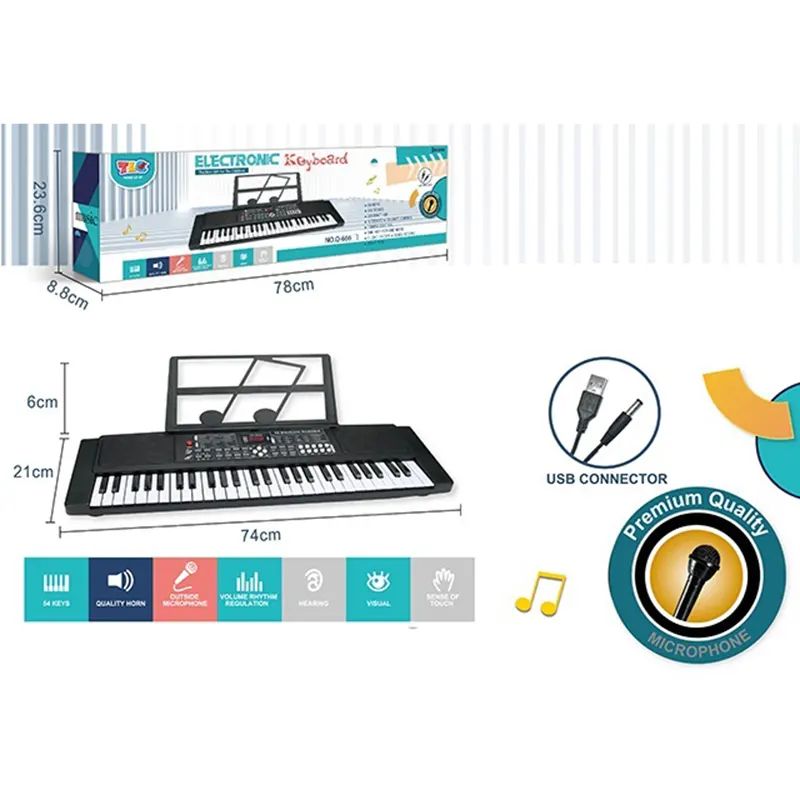 Електронно пиано с 54 клавиша, микрофон и USB захранване. Подходящо за деца и начинаещи, с множество музикални функции и стойка за ноти.