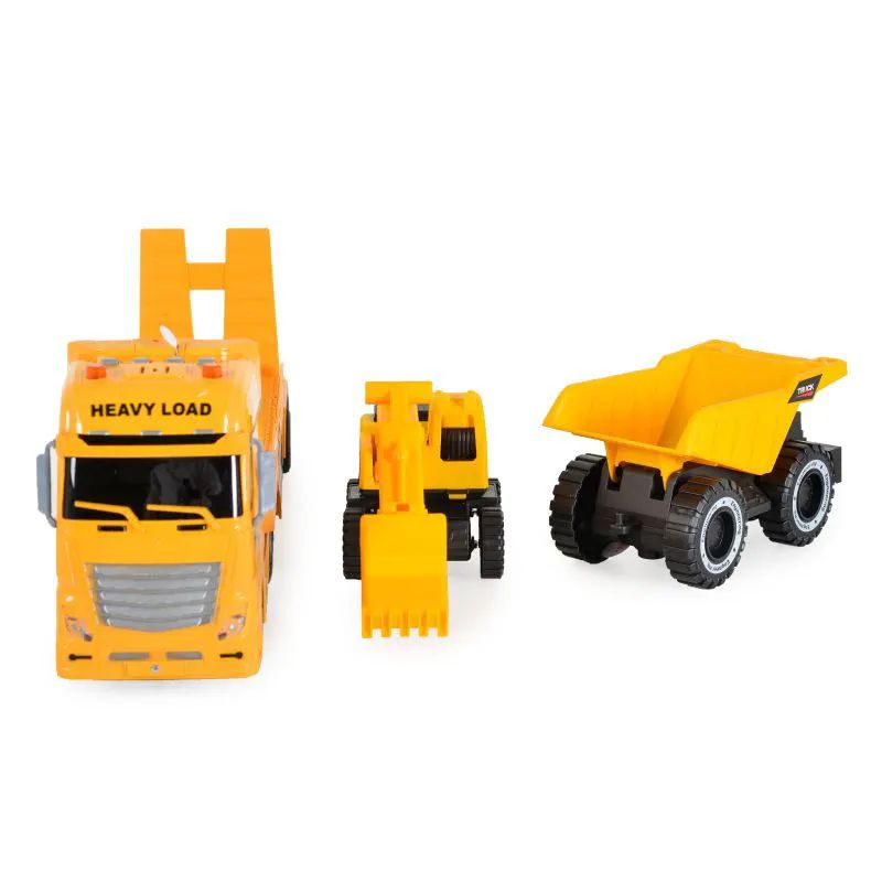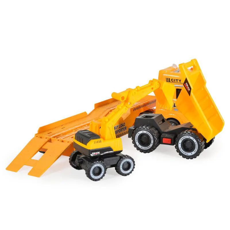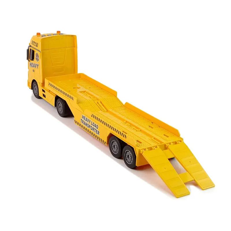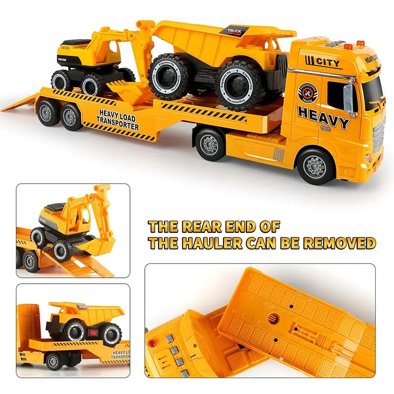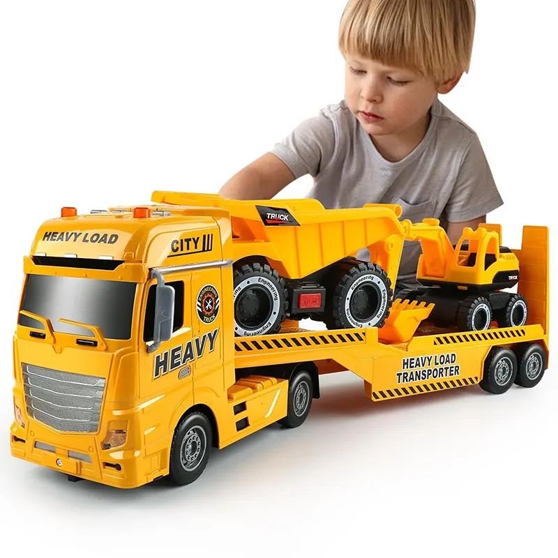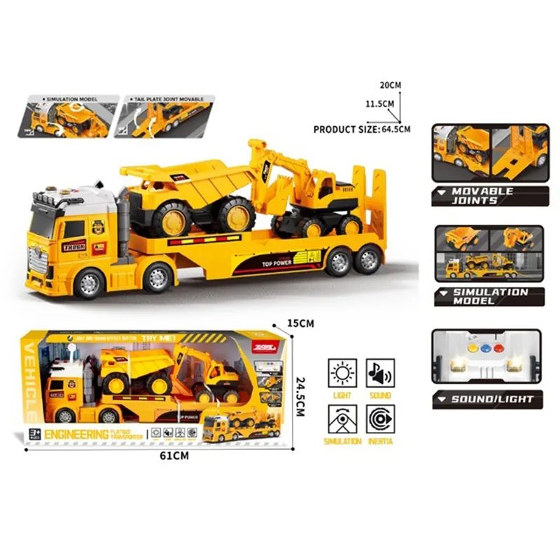 Голям детски камион превозвач с дължина 64 см, включващ багер и самосвал. Със светлинни и звукови ефекти и подвижни елементи за по-реалистична игра.