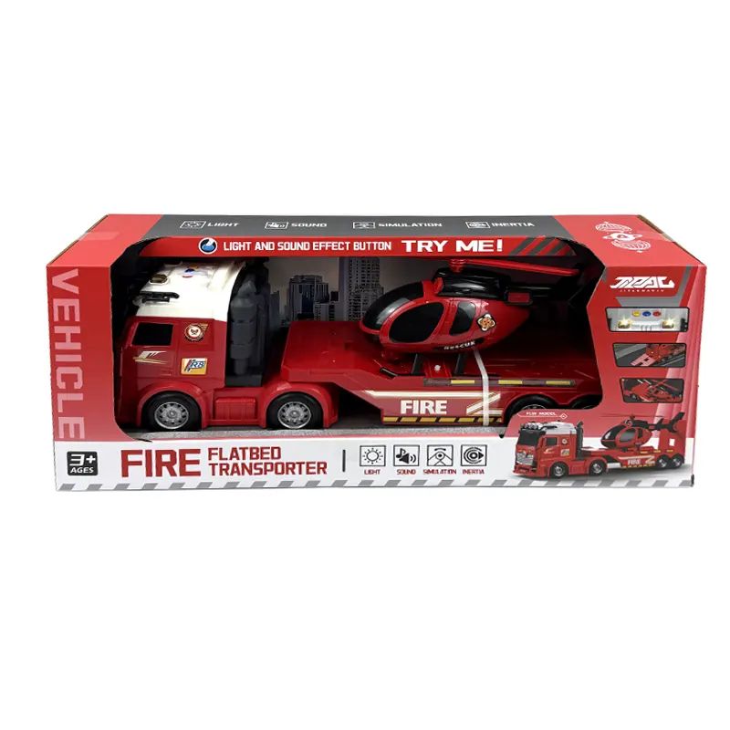 Голям пожарен камион автовоз с дължина 55 см, включващ хеликоптер. Със светлини, звукови ефекти и подвижни елементи за реалистична игра.