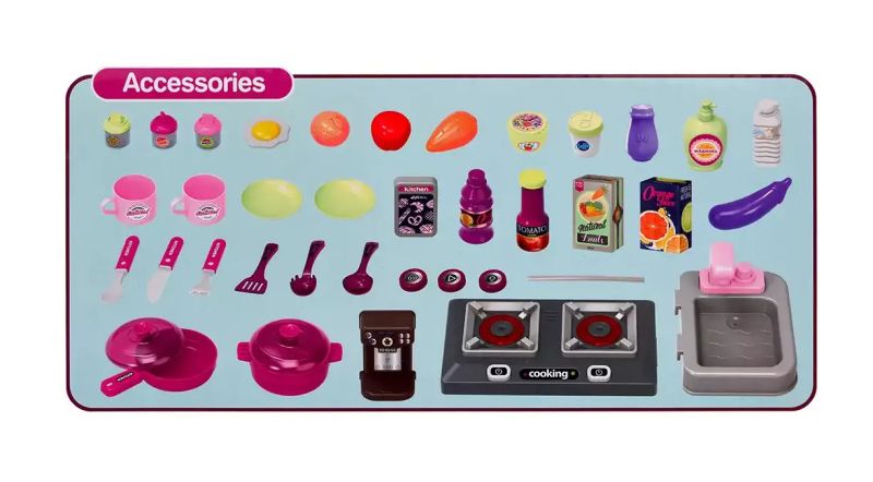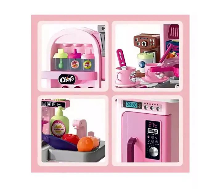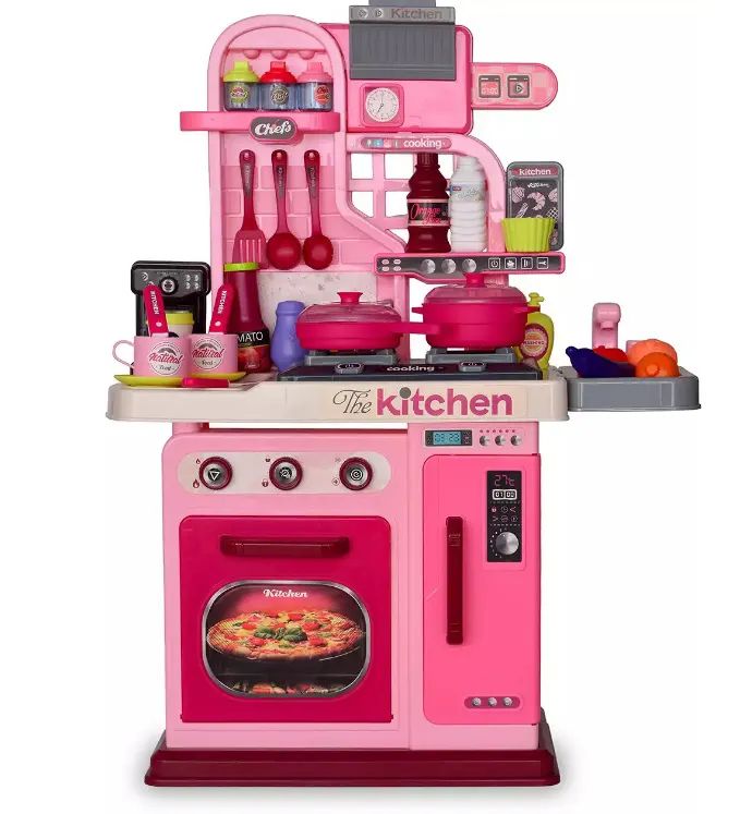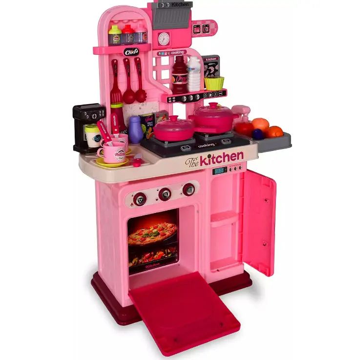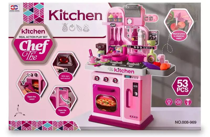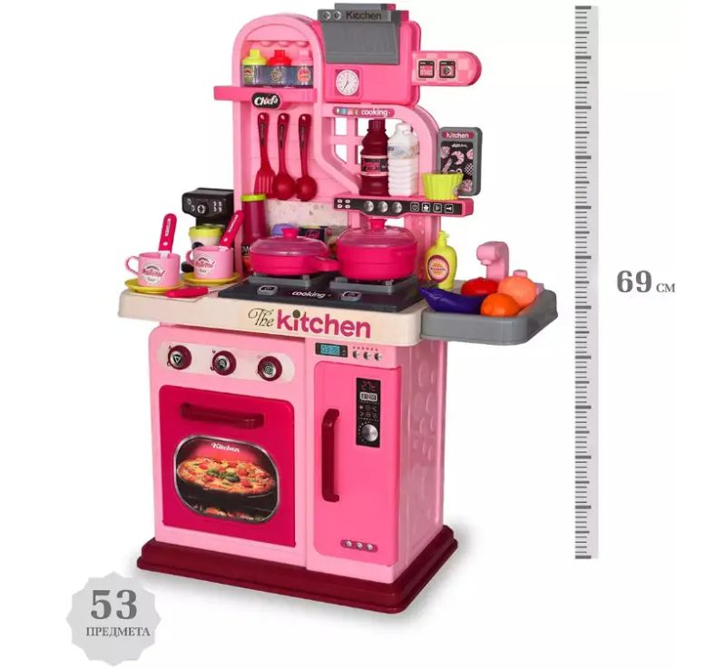 Розова детска кухня с 53 части, включваща съдове, прибори, хранителни продукти и фурна. Със светлинни и звукови ефекти за реалистична игра.