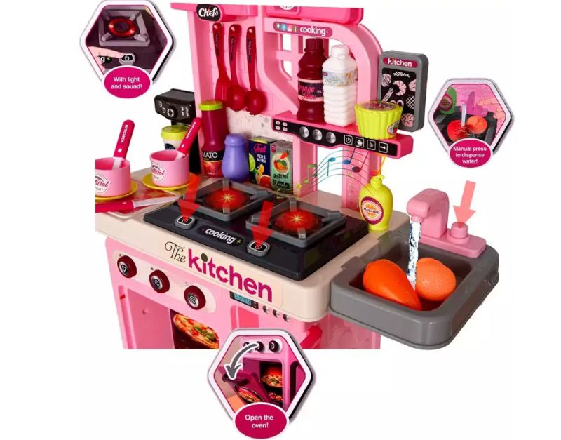 Тази розова детска кухня с 53 части е чудесна играчка за ролеви игри и забавления. Комплектът включва фурна, котлони, мивка, съдове, прибори, чаши и разнообразни хранителни продукти. Кухнята разполага със светлинни и звукови ефекти, които правят играта още по-реалистична и интересна. Подходяща е за деца над 3 години, като развива въображението, социалните умения и креативността. Изработена е от безопасни и устойчиви материали.