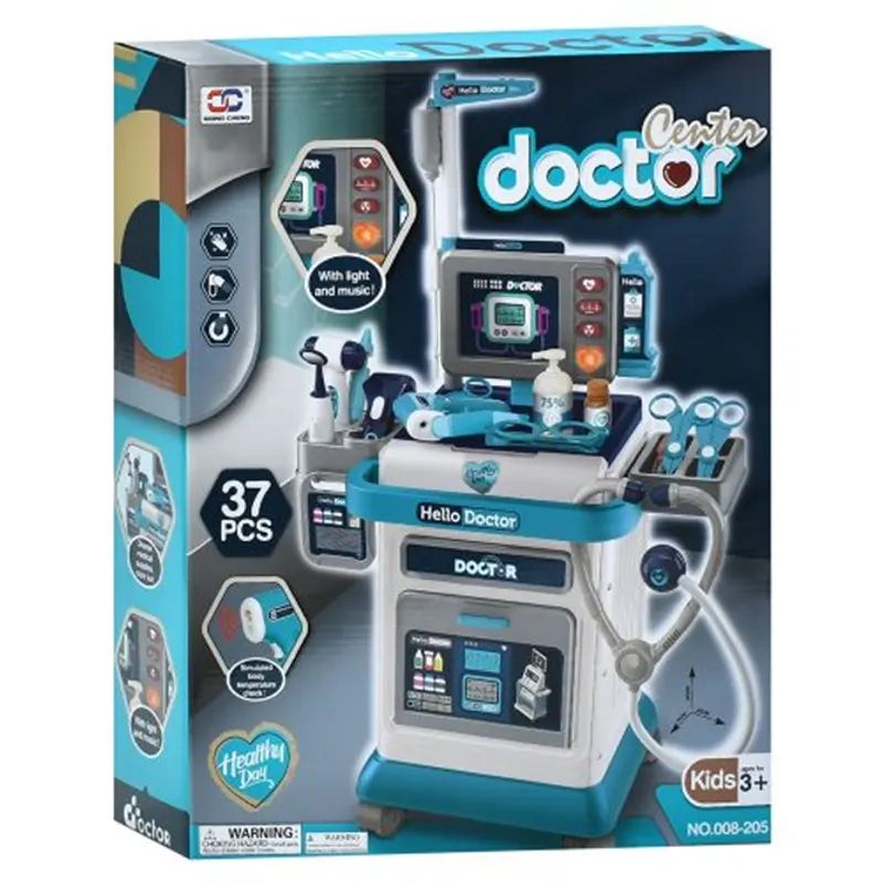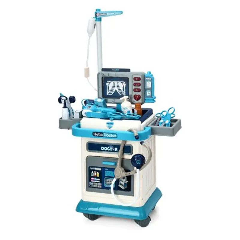 Детският лекарски комплект с медицинска количка е създаден за малките любители на ролевите игри. Комплектът съдържа 37 части, сред които стетоскоп, спринцовка, ножици, медицински уреди и други аксесоари. Количката е снабдена със светлинни и музикални ефекти, които правят играта още по-реалистична и увлекателна. Чрез този комплект децата развиват въображението си, социалните умения и способността да играят в екип. Подходящ за деца над 3 години, изработен от безопасни материали.