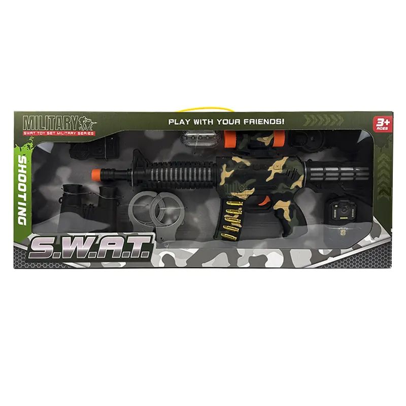 Полицейският комплект S.W.A.T. е създаден за деца, които обичат приключенията и ролевите игри. В него са включени разнообразни аксесоари – автомат със светлинни и звукови ефекти, белезници с ключове, радиостанция, значка, бинокъл и компас.