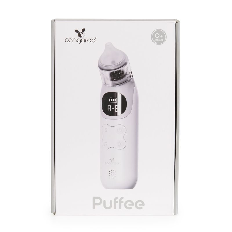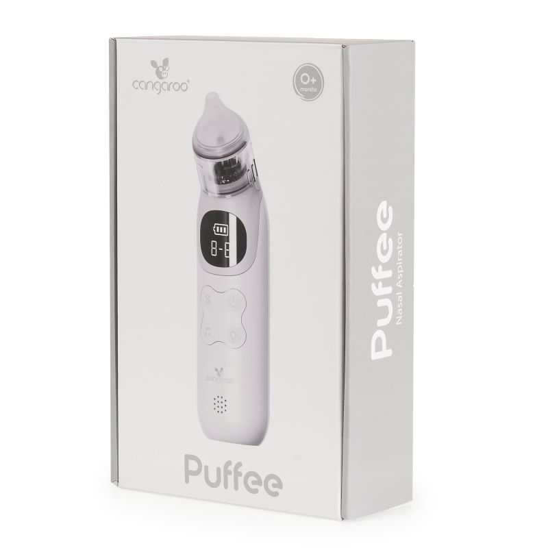 Puffee, Cangaroo е електрически аспиратор, създаден за лесно, нежно и ефективно почистване на носния секрет. Благодарение на ефективната и щадяща всмукателна система с 5 регулируеми степени, уредът осигурява бързо облекчение и улеснява дишането на детето. Подходящ е за употреба при възраст над 0 месеца и се препоръчва при хрема или за почистване на носната кухина.
