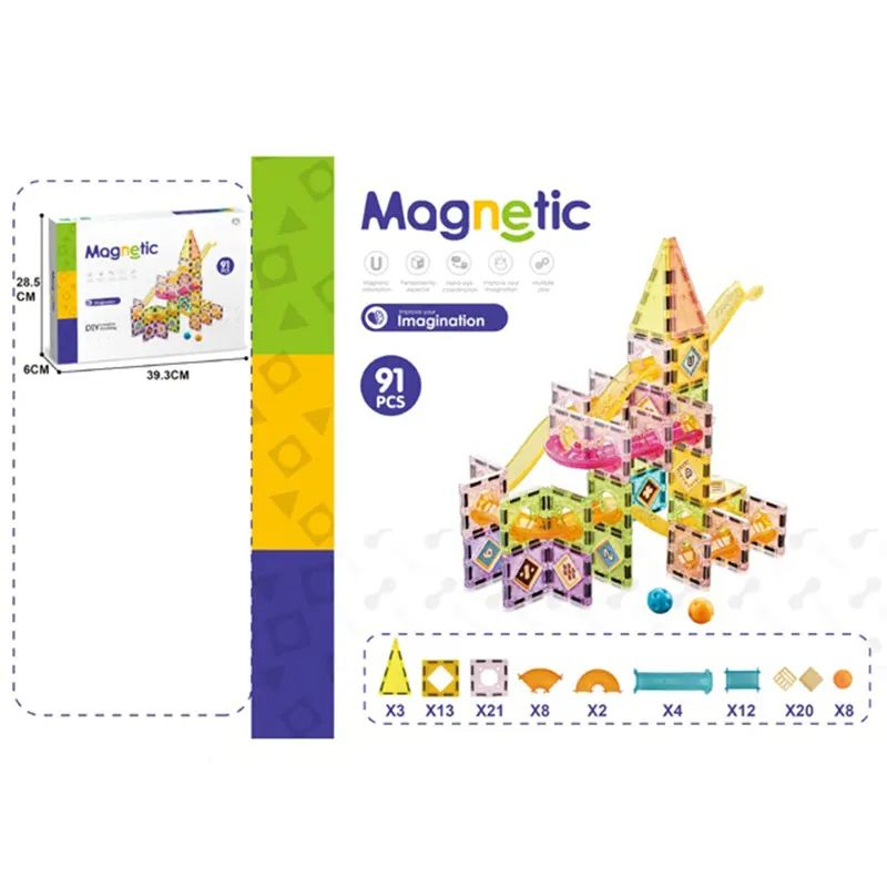Магнитен конструктор с 91 цветни елемента за създаване на различни фигури и конструкции. Подпомага развитието на въображението, логическото мислене и фината моторика на децата.