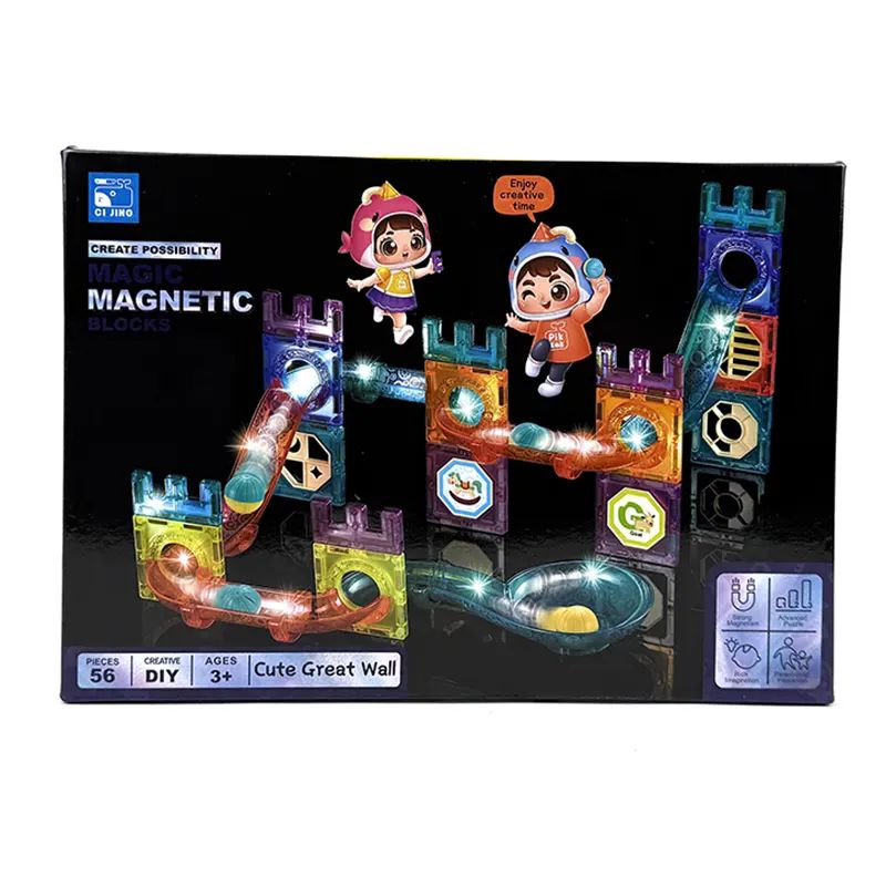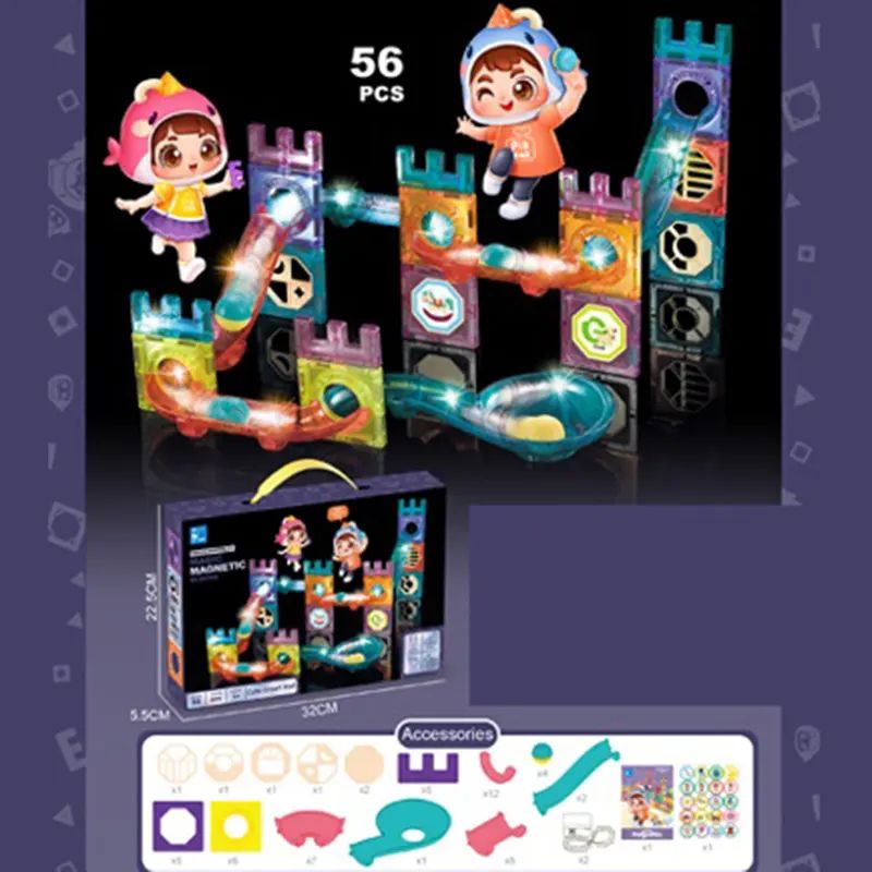 Магнитен конструктор с писта за топчета, 56 части, Цветен, Образователен комплект за деца