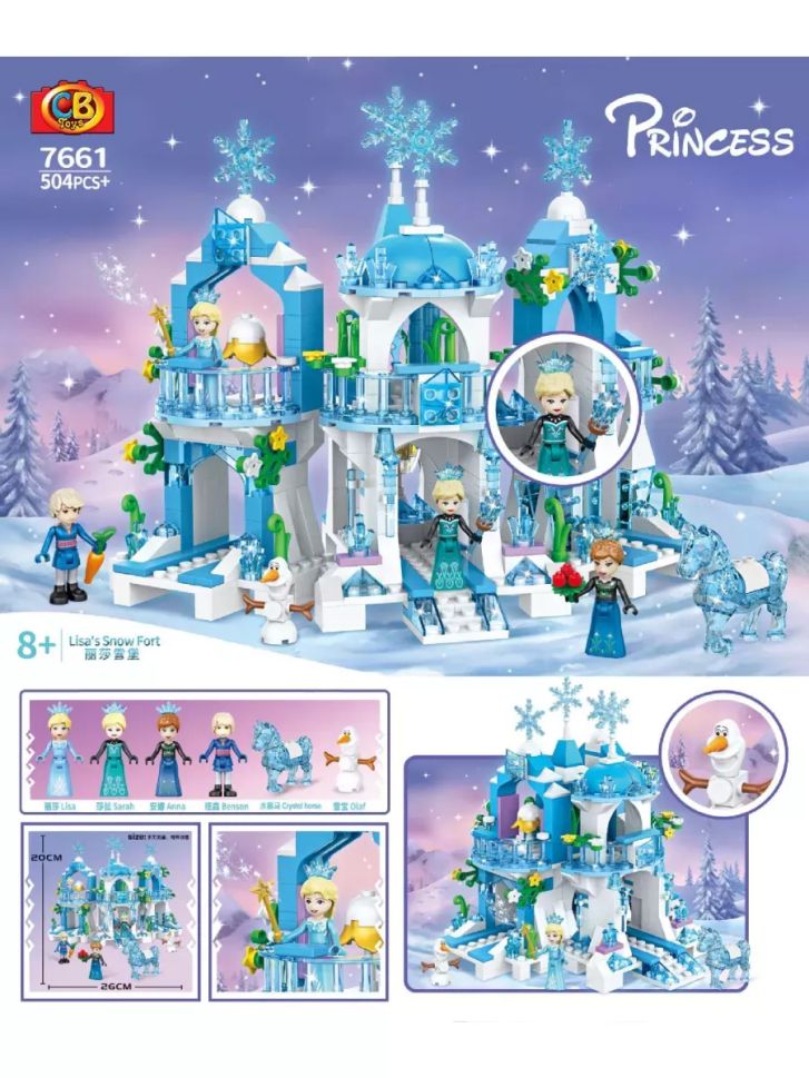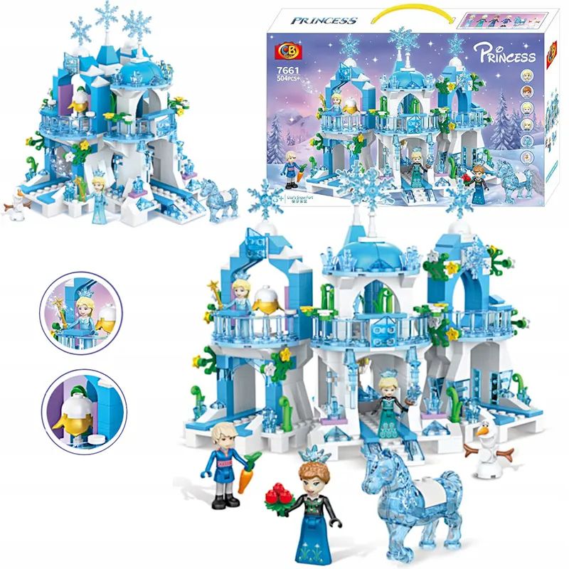 Голям конструктор Princess с 504 части за сглобяване на кристален леден замък. Включва фигурки на Елза, Анна, Олаф и конче. Подходящ за деца над 8 години.