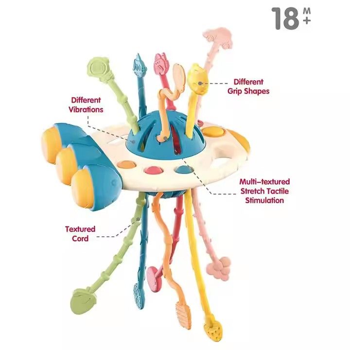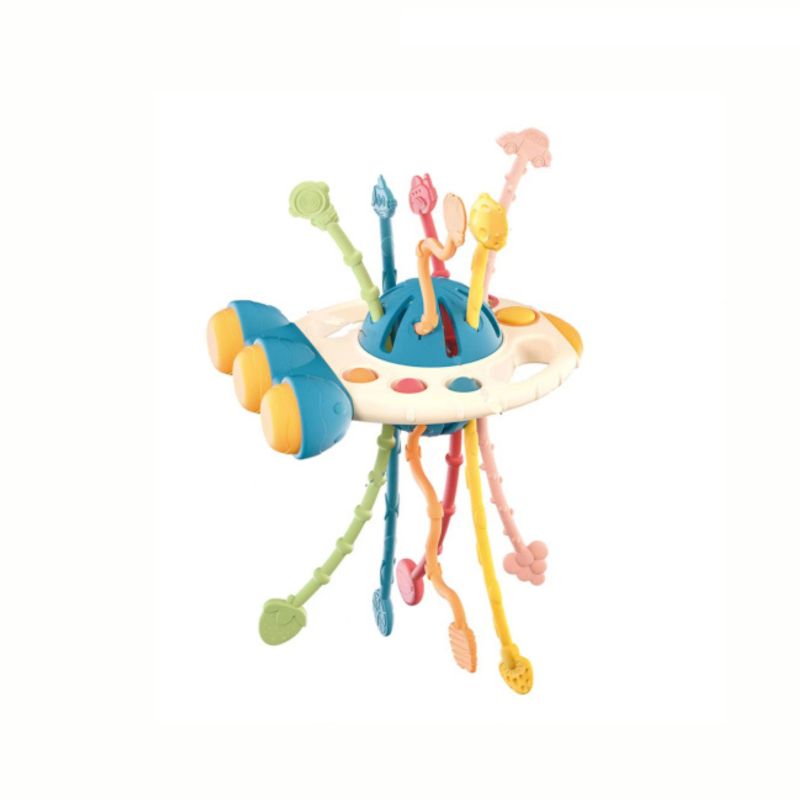 Сензорната играчка UFO стимулира сетивата, фината моторика и координацията око–ръка чрез забавна и образователна игра. Изработена е от мек, безопасен силикон, подходящ за нежните ръчички и венци на детето.