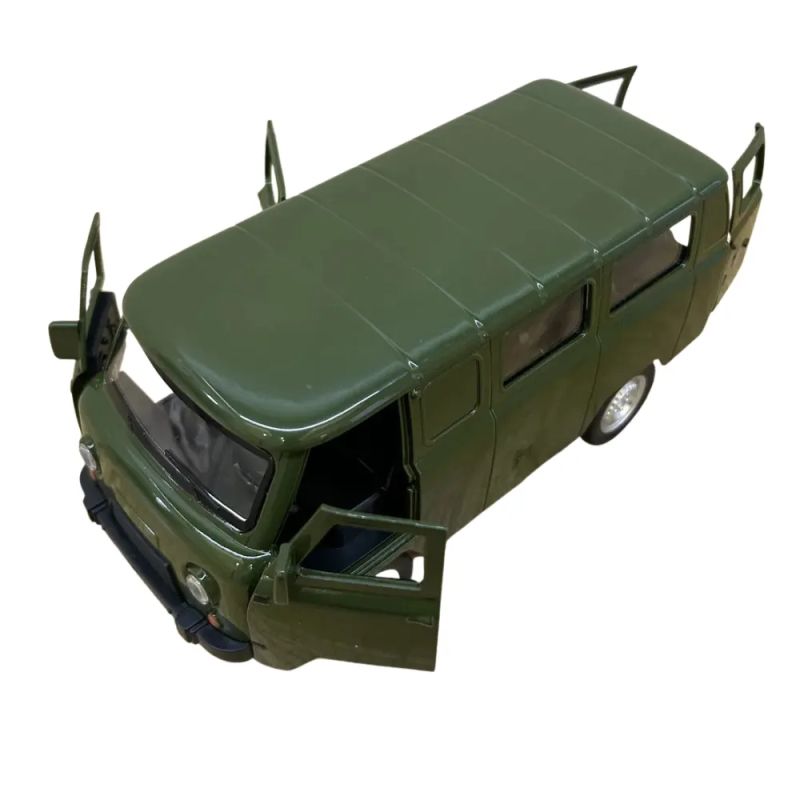 Този метален микробус UAZ в зелен цвят пресъздава емблематичния облик на класическия модел. Изработен с внимание към детайла, той разполага с инерционен механизъм, който осигурява плавно движение при засилване, както и отварящи се врати за по-реалистична игра.
