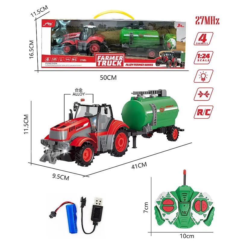 Влез в ролята на фермер с този реалистичен радиоуправляем трактор с ремарке! Играчката е с мащаб 1:24 и предлага детайлна изработка, комбинираща устойчивост и забавление.