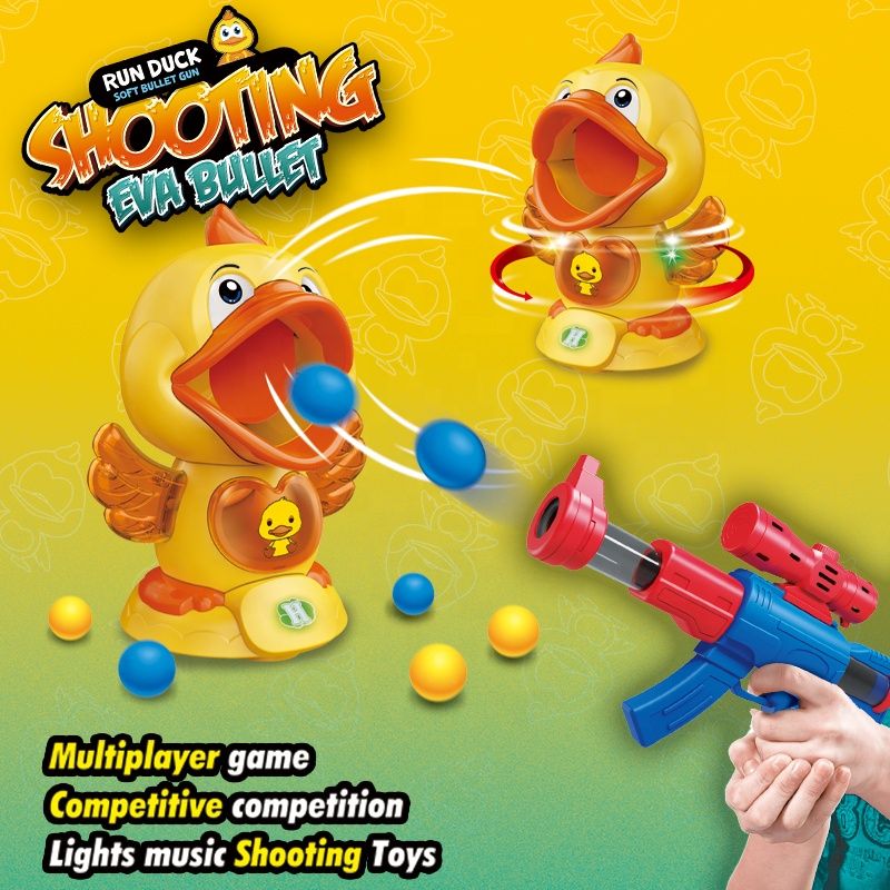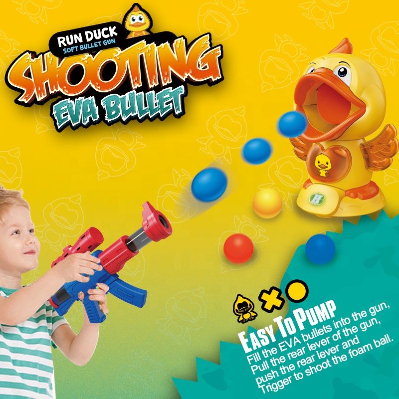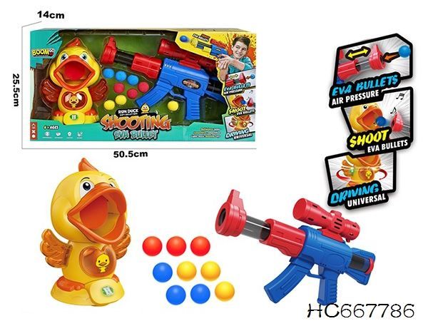 Забавен комплект за стрелба с пистолет и движеща се мишена пате. Включва EVA топчета и безопасен механизъм с въздушно налягане.