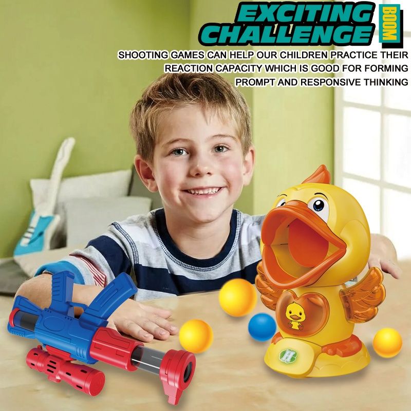 Пистолетът изстрелва меки EVA топчета чрез въздушно налягане, без батерии или опасност от нараняване. Движещото се пате е мишена, която се отваря и затваря, добавяйки динамика и предизвикателство към играта.