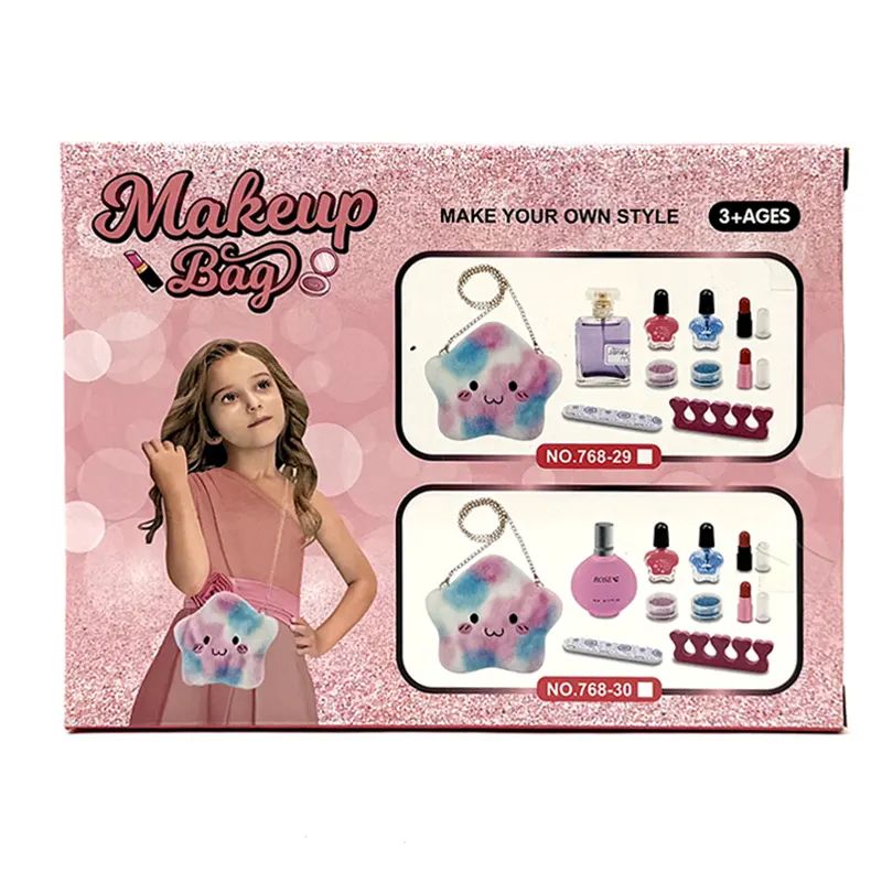Включва лак за нокти, червила, пилички и блясък, всичко това подредено в мека и цветна чантичка със златиста верижка. Продуктите са безопасни за детска кожа и подходящи за игра и ролеви забавления.