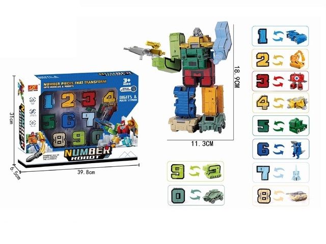 Уникален робот Number Robot, който се сглобява от 10 части с формата на цифри. Всяка цифра се превръща в превозно средство, а заедно образуват мощен робот.