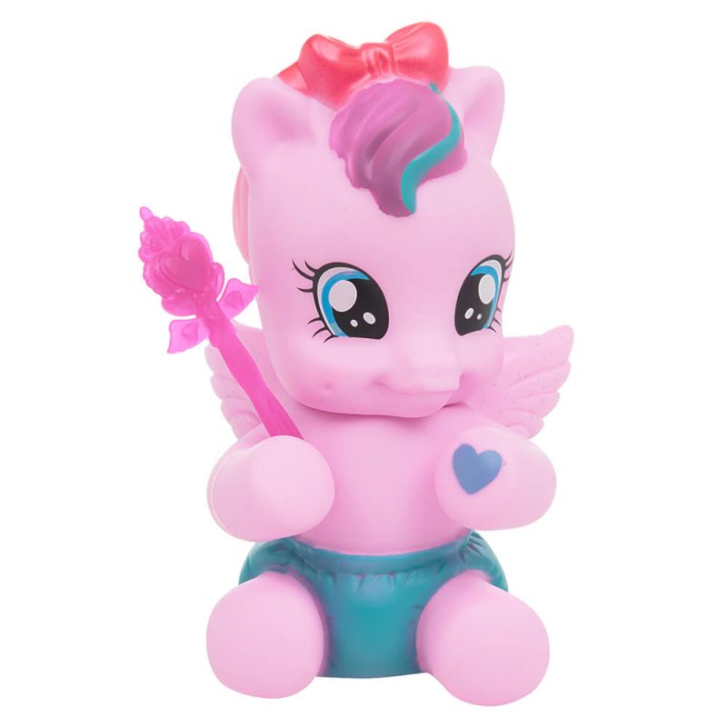 Играчката има цветна гривичка и вълшебна пръчка, с която децата могат да се потопят в приказни игри.
