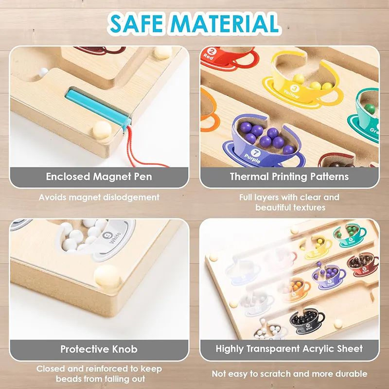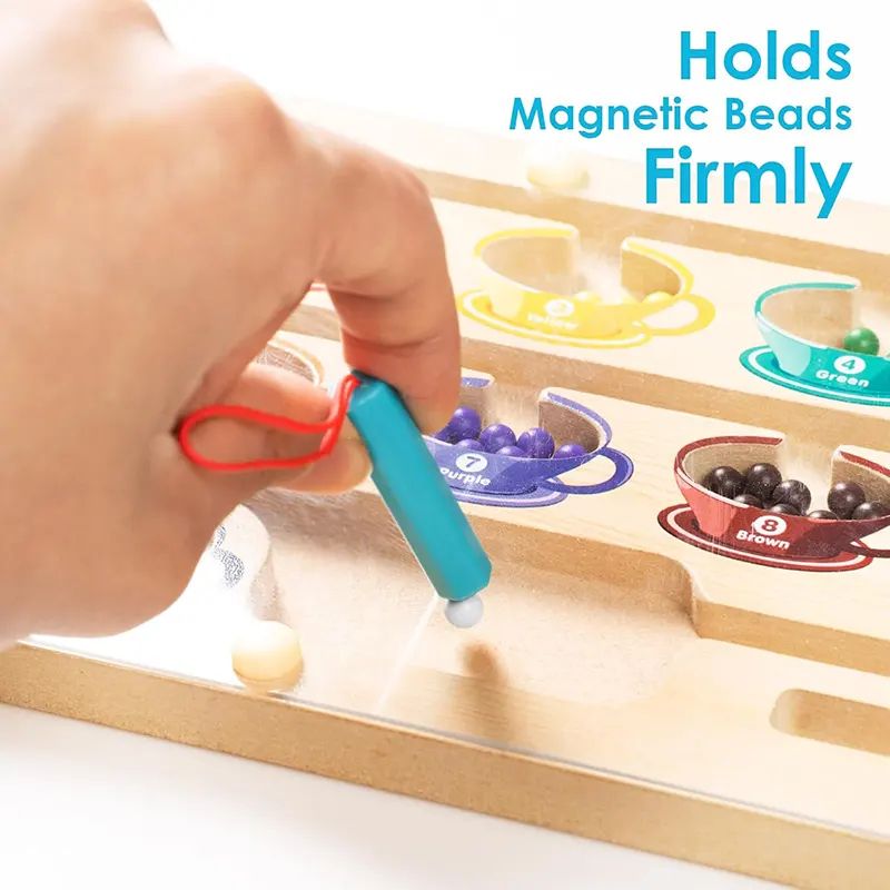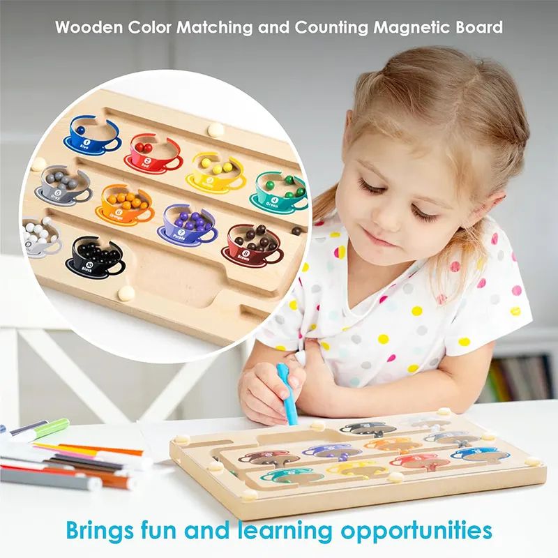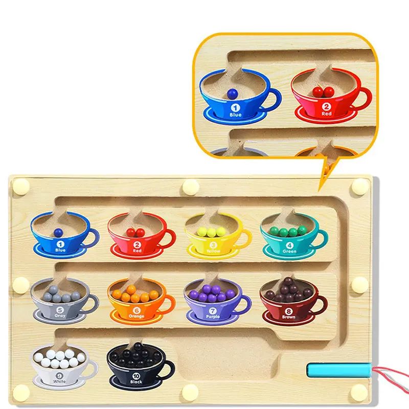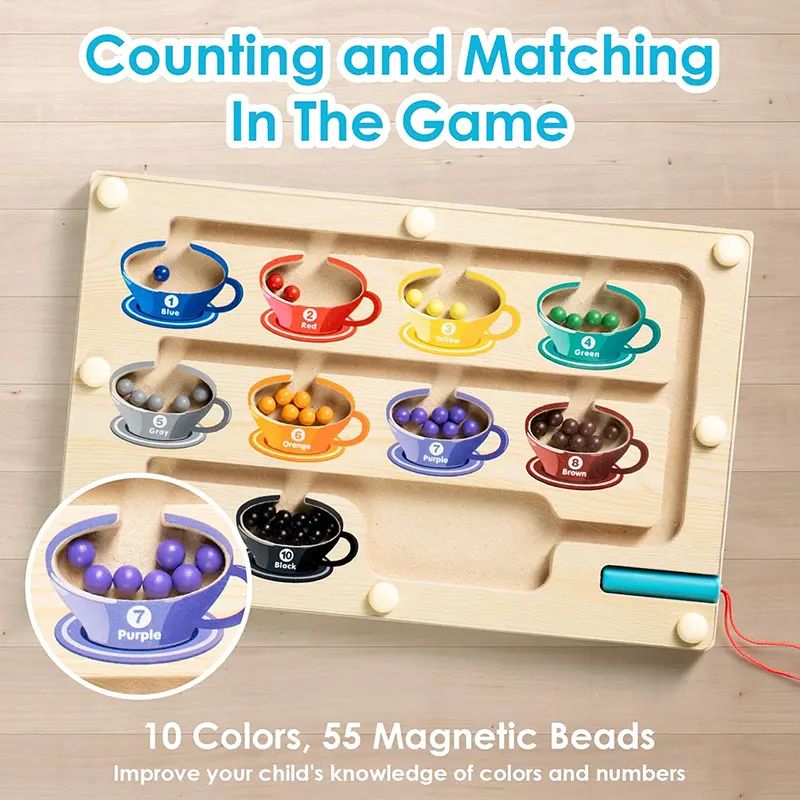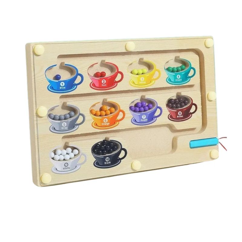 Открий забавен начин детето да учи с тази дървена магнитна дъска с цветове! Всяка чашка има различен цвят и номер, а малките магнитни топчета трябва да бъдат подредени с помощта на включената магнитна писалка.
