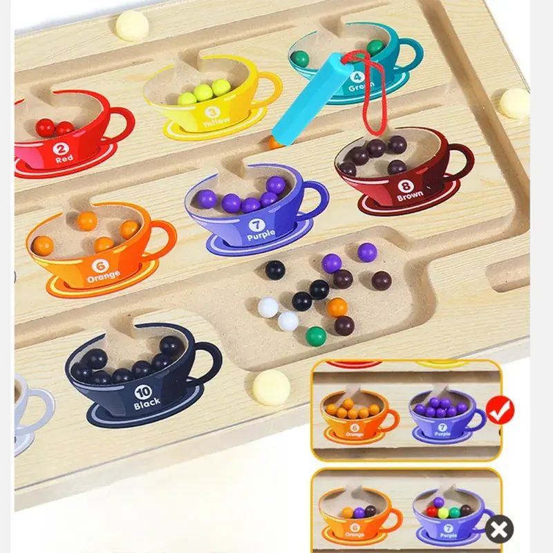 Образователна магнитна дъска от дърво с цветни чашки и топчета. Развива логика, координация и разпознаване на цветове.