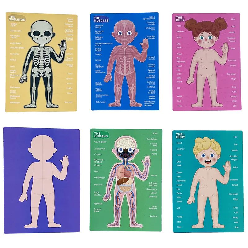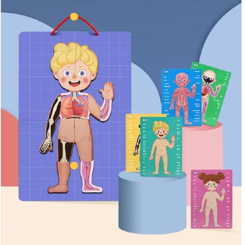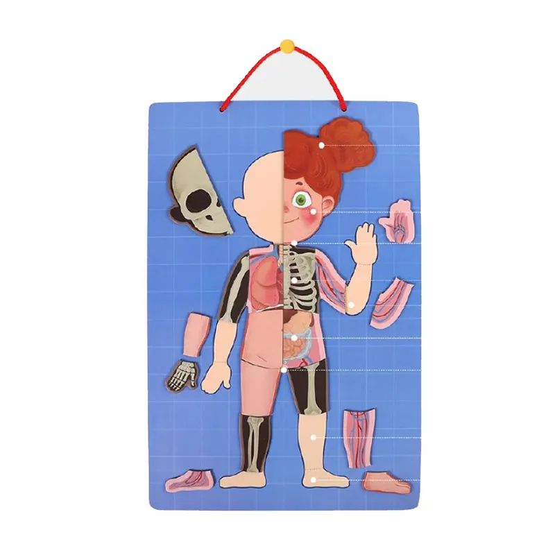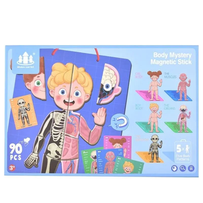Този магнитен пъзел „Човешко тяло“ съдържа 90 части, които помагат на децата да научат основните системи на тялото – мускули, скелет, органи и мозък.