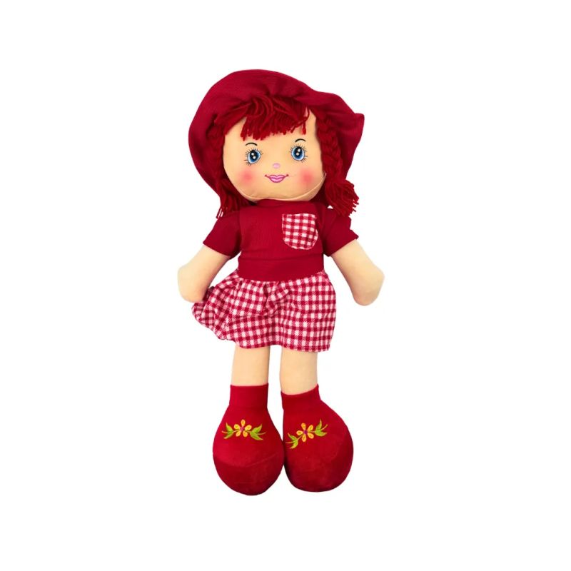 Мека парцалена кукла с червена рокличка, височина 55 см. Говори на български език и произнася забавни изрази. Подходяща за игра и гушкане.