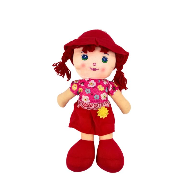 Очарователната парцалена кукла с червен тоалет ще зарадва всяко дете с усмивката си и сладкия си глас.