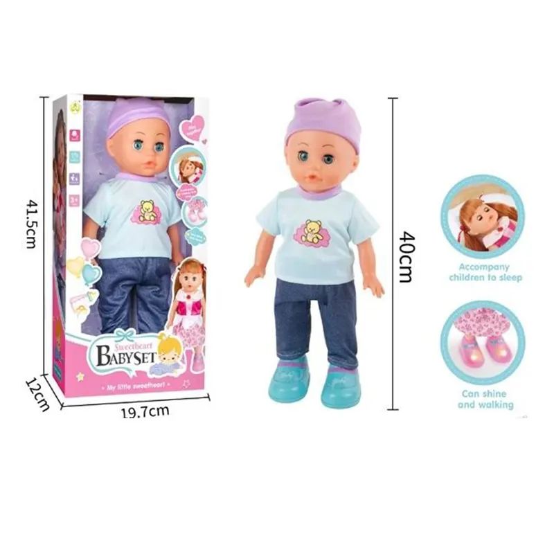 Очарователна кукла бебе, която ходи, издава звуци и свети! С височина 40 см, облечена в сладък комплект дрешки. Подходяща за деца над 3 години.