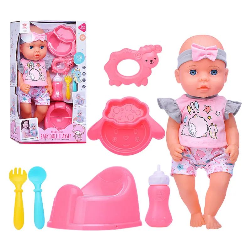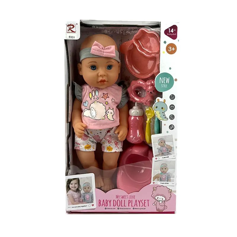 Комплектът съдържа сладка бебе кукла и всичко необходимо за игра „като с истинско бебе“ – гърне, шише, чинийка, прибори и играчка. Куклата е облечена в красиво розово облекло с панделка и има подвижни ръце и крачета. Играта с нея насърчава грижовността и въображението у децата, като им помага да развиват социални умения и емоционална интелигентност. Изработена е от безопасни материали и е подходяща за деца над 3 години.