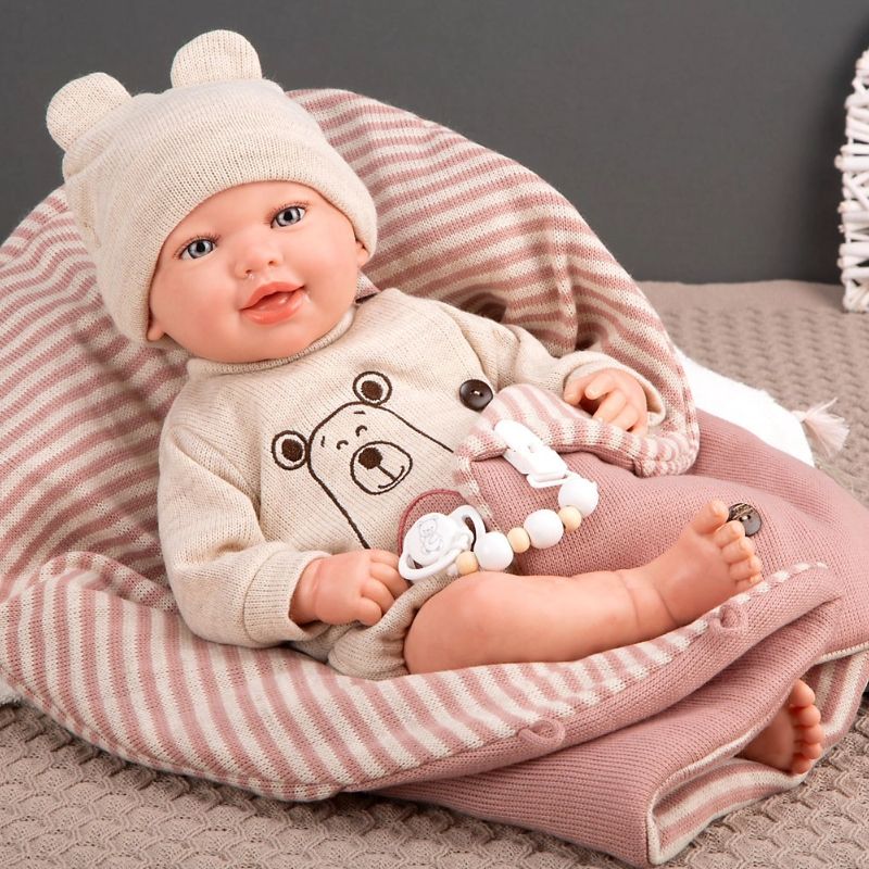 Усмихната кукла-бебе Лейн с розов спален чувал и биберон - 45 см
