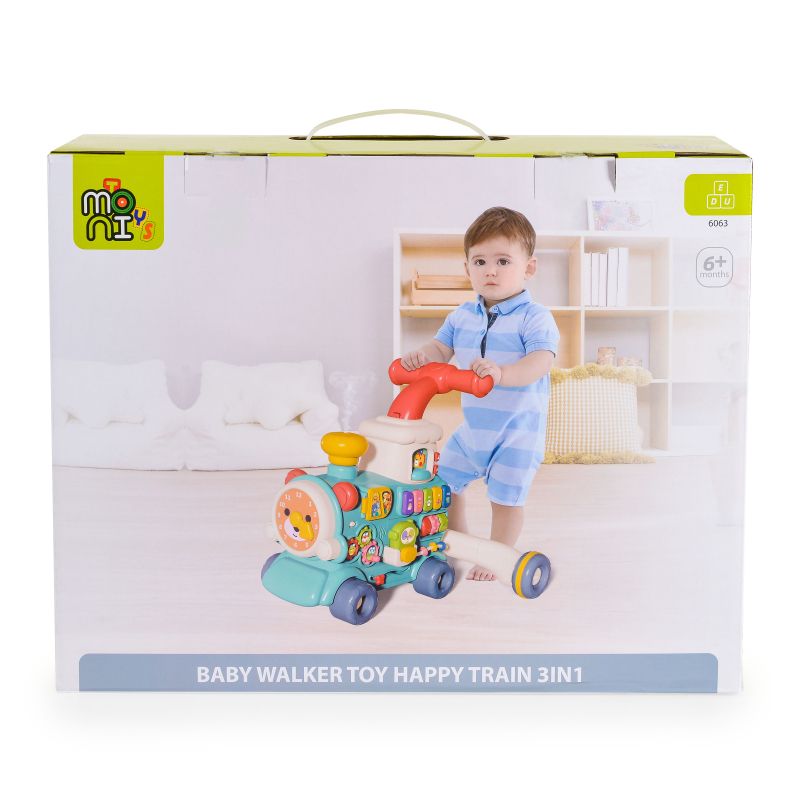 Играчката за прохождане 3в1 Happy Train, Moni Toys комбинира три функции в едно забавно и развиващо изживяване. Тя подпомага прохождането, стимулира двигателните умения и насърчава детето да открива света чрез игра.