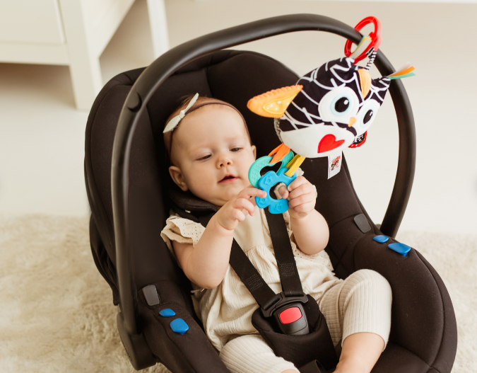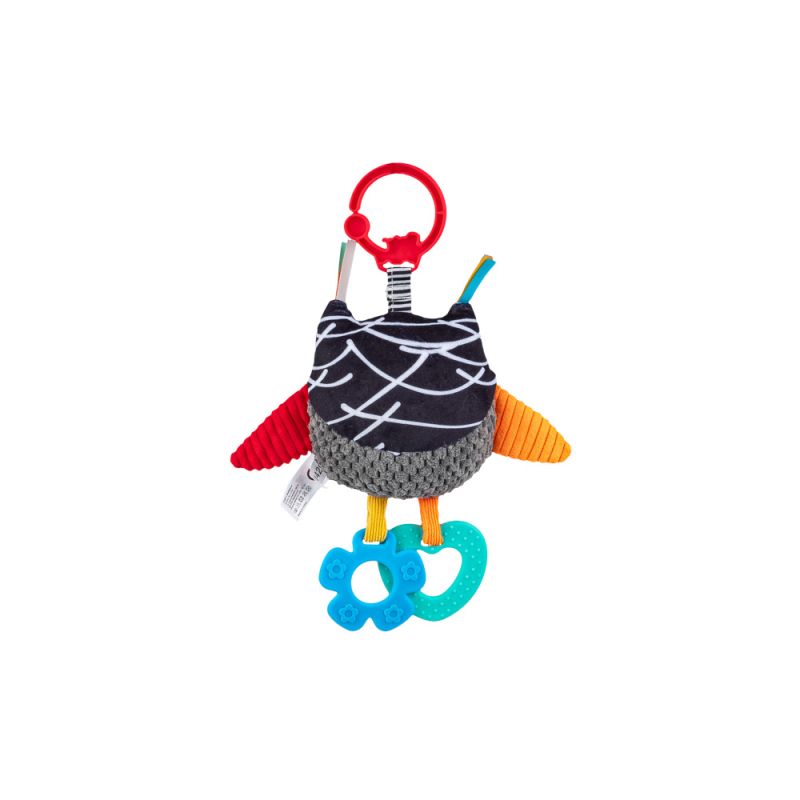 Играчката е изработена от различни по текстура материали, които развиват сетивното възприятие и стимулират изследователския дух на детето. Има две дъвкалки, които носят облекчение при никнене на зъбки, а компактният дизайн с практичен клипс позволява лесно закрепване навсякъде.