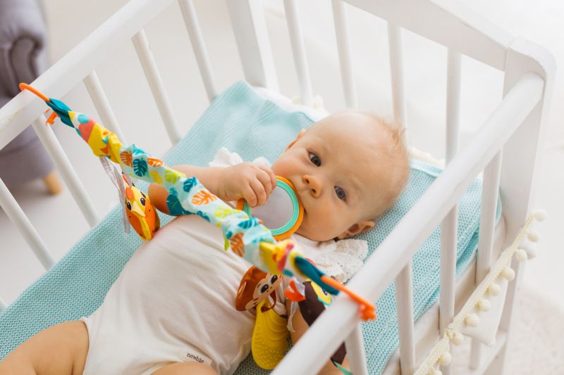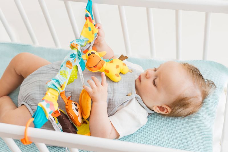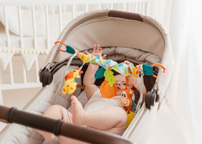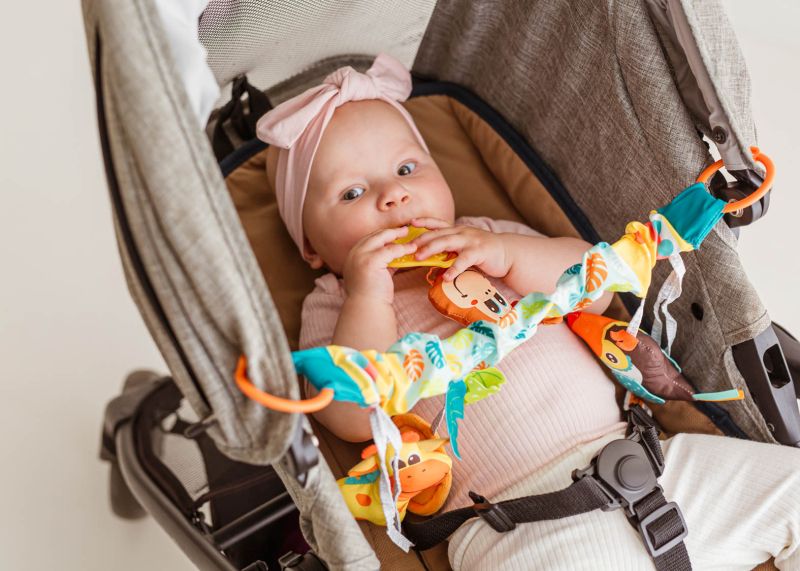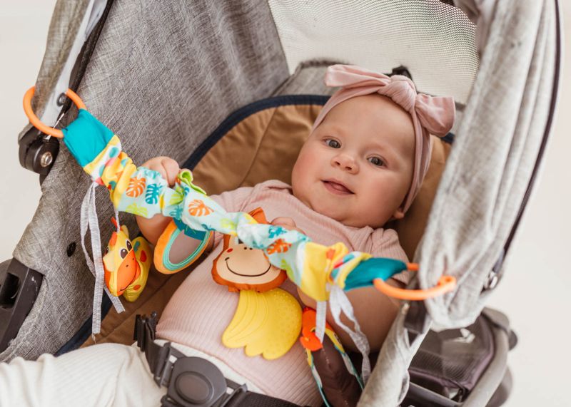Цветна и сетивно стимулираща играчка, създадена да ангажира вниманието на бебето по време на разходка. Комбинира различни текстури, звуци и форми, които развиват любопитството и моториката. Еластичната лента и универсалните начини за закрепване позволяват лесно поставяне на количка, столче или кошара.