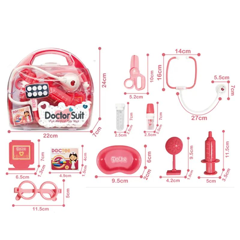 Този розов детски лекарски комплект Doctor Suit е чудесен избор за малките доктори и медицински изследователи. Комплектът включва разнообразни медицински инструменти, изработени в удобни детски размери, като всички се съхраняват лесно в прозрачно и компактно куфарче.